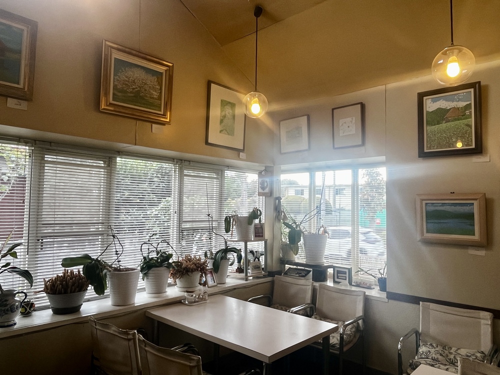 白を基調とした店内はカウンターとテーブル席があり、窓際や壁には観葉植物や絵画が飾られていました。