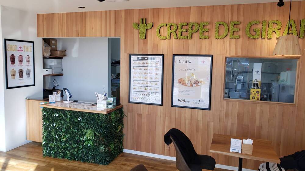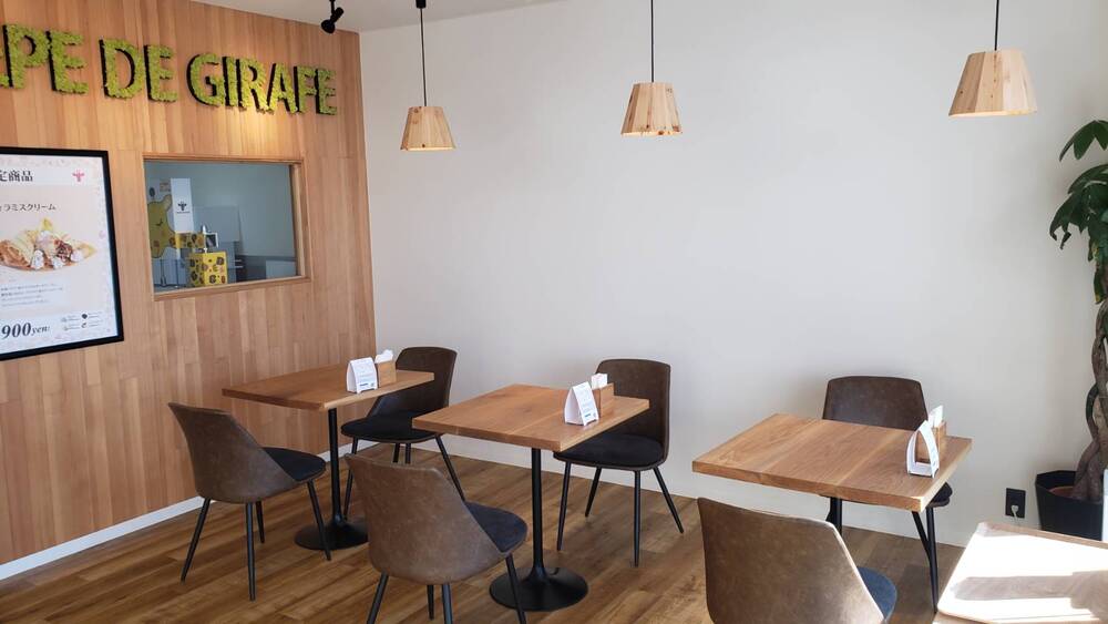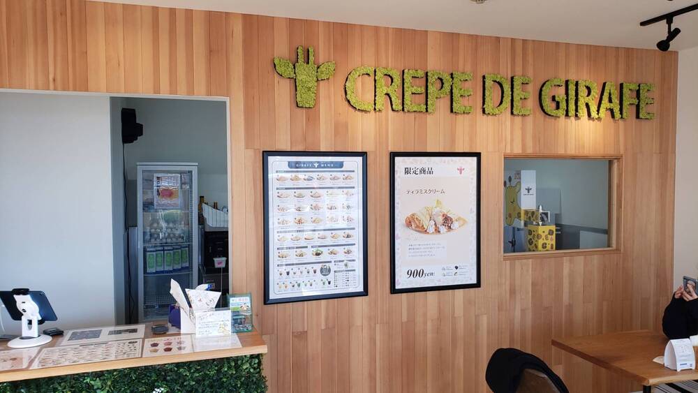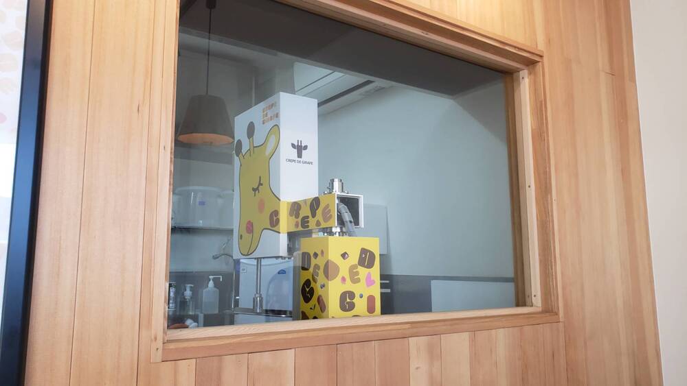 イートイン席の一番奥から見える厨房の様子。キリン柄のクレープ焼き機が!中でクレープを焼くスタッフさんが笑顔で手を振ってくれました♪