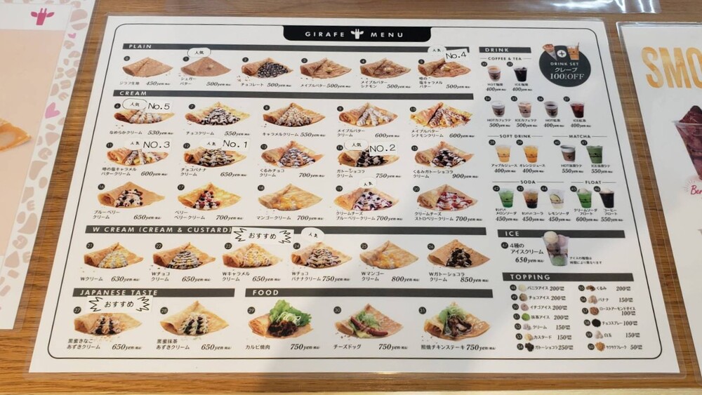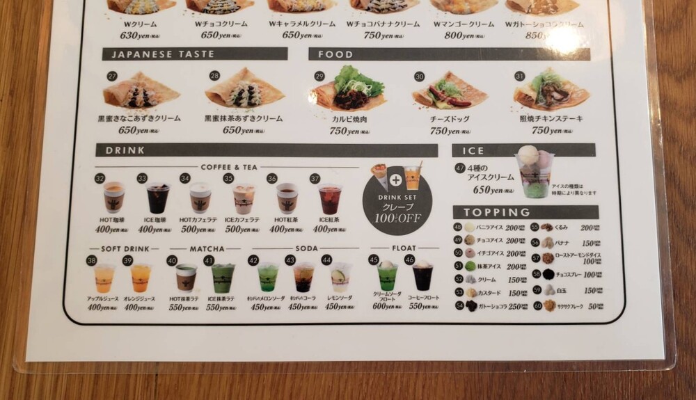 また、ドリンクメニューやクレープへのトッピングにアイスクリームのメニューもあります。ドリンクはクレープとセットで注文すると100円OFFになるのでこちらもおすすめです!