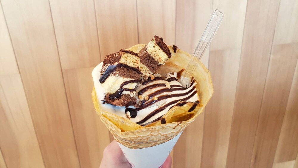 クレープにトッピングされているティラミス生地は、イタリア産マスカルポーネチーズとクリームチーズをブレンドした本格ティラミス!クレープの中には濃厚なティラミスアイスが入っています。