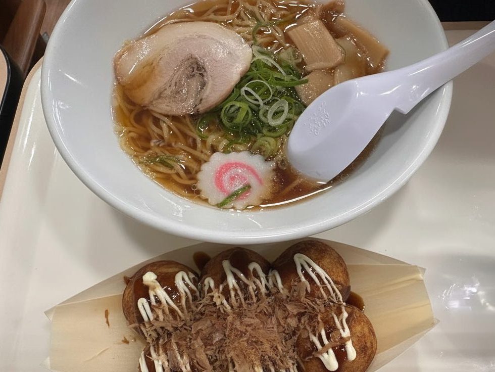 注文後、たこやきを先に渡されました。つい食べそうになりながら、待つこと数分。ラーメンとセットでいただきます。ラーメンとたこやきの組み合わせ、贅沢~と大喜び。