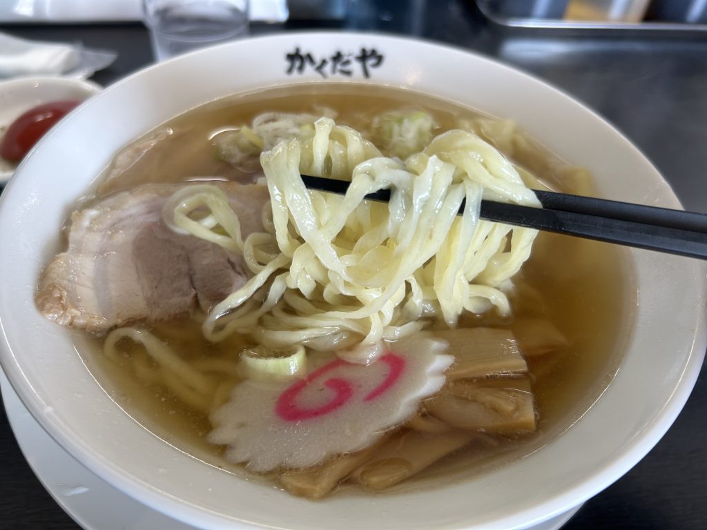 佐野ラーメンと言えば、透きとおった醤油スープに青竹打ちの中太のちぢれ平麺が特徴ですが、「拉麺かくだや」さんも、まさに王道の佐野ラーメンです。