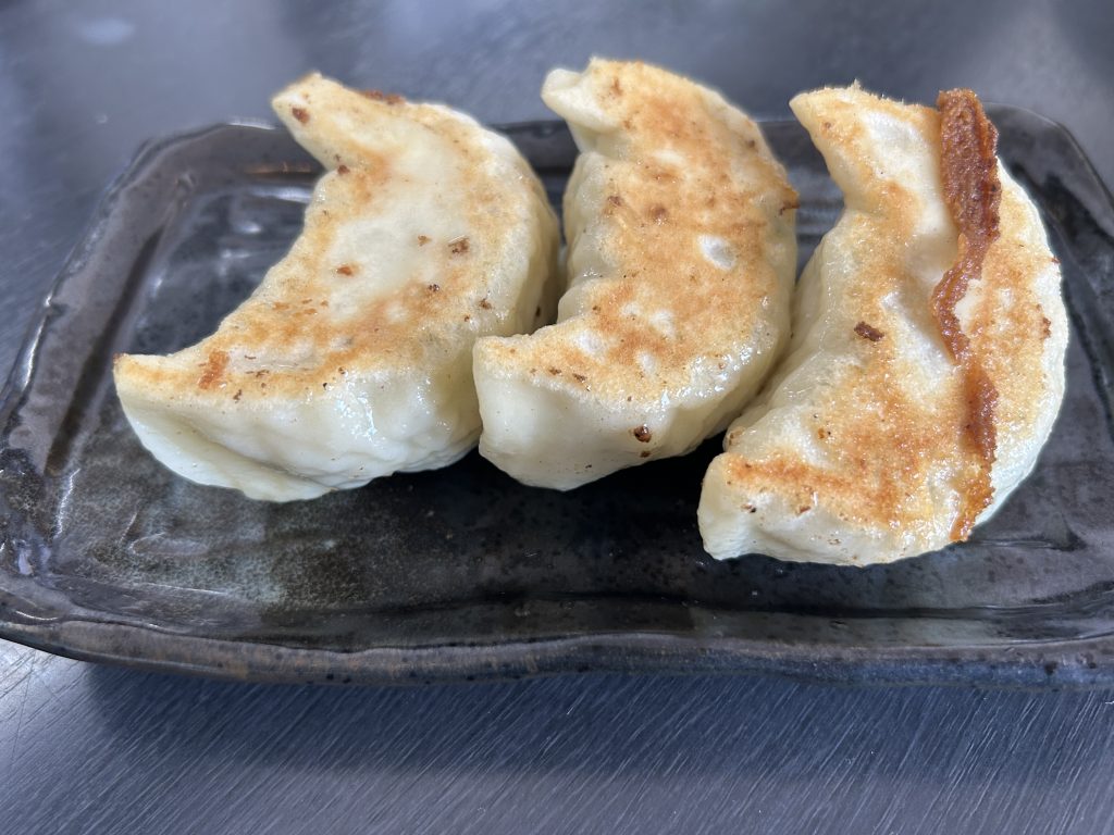 そして、こちらは「拉麺かくだや」さん名物、自家製ぎょうざ3個で330円。一般的な餃子の2倍近くある大きなぎょうざ。パリッとした皮にたっぷりの具。食べ応えあります。酢とこしょうで食べるとさっぱりして、美味しいです。