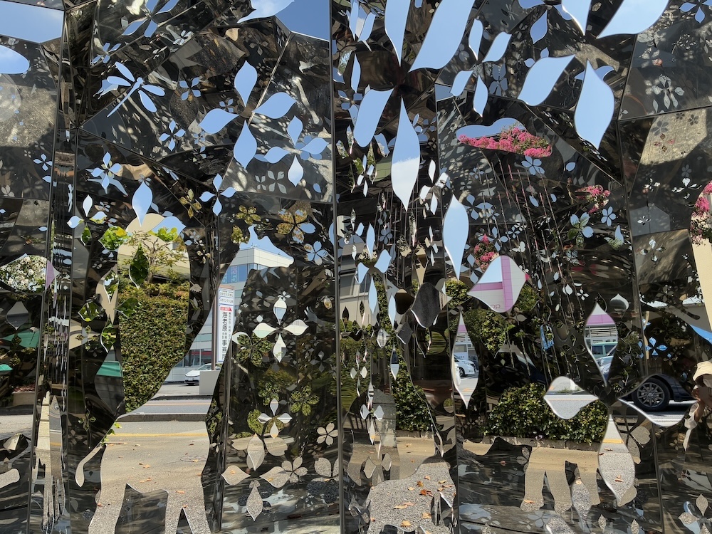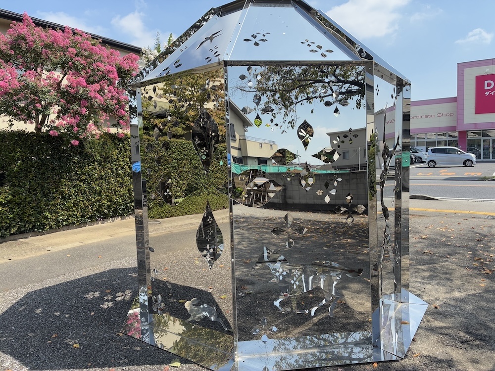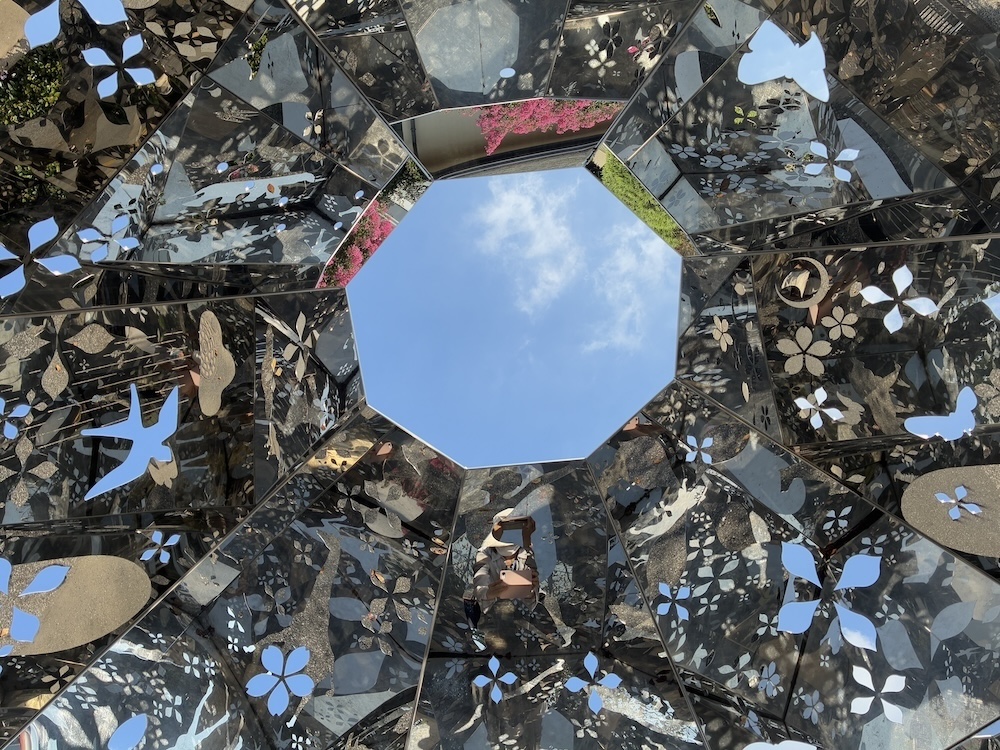 中に入って見ると空が見えて、周りの景色もうつし出されてまるで万華鏡の中に入ったような感じです。