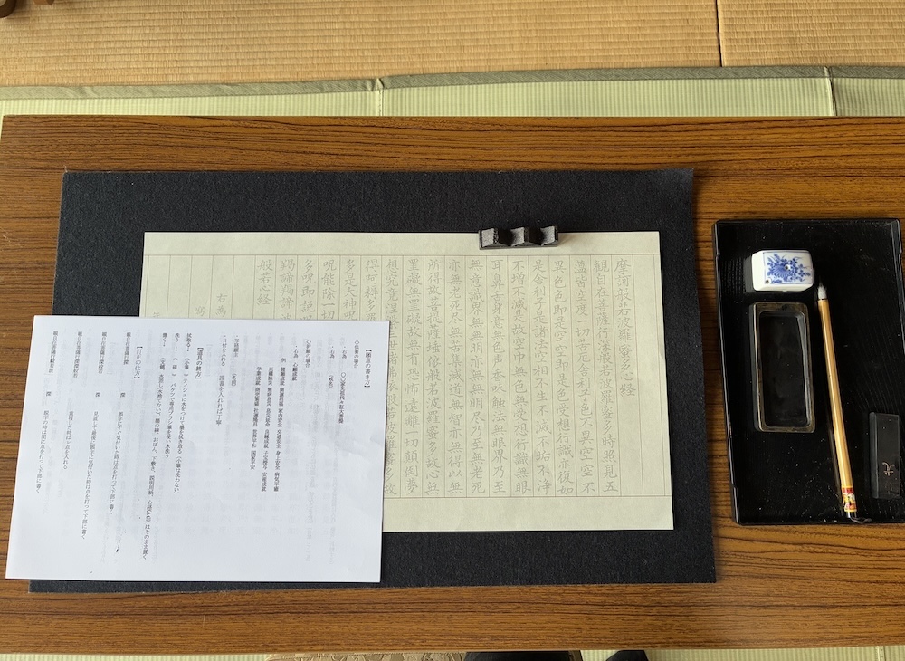 短いお経ですが、これから写経をすると思うと心をこめて唱えようと、自然に気持ちが正されていくように感じられました。